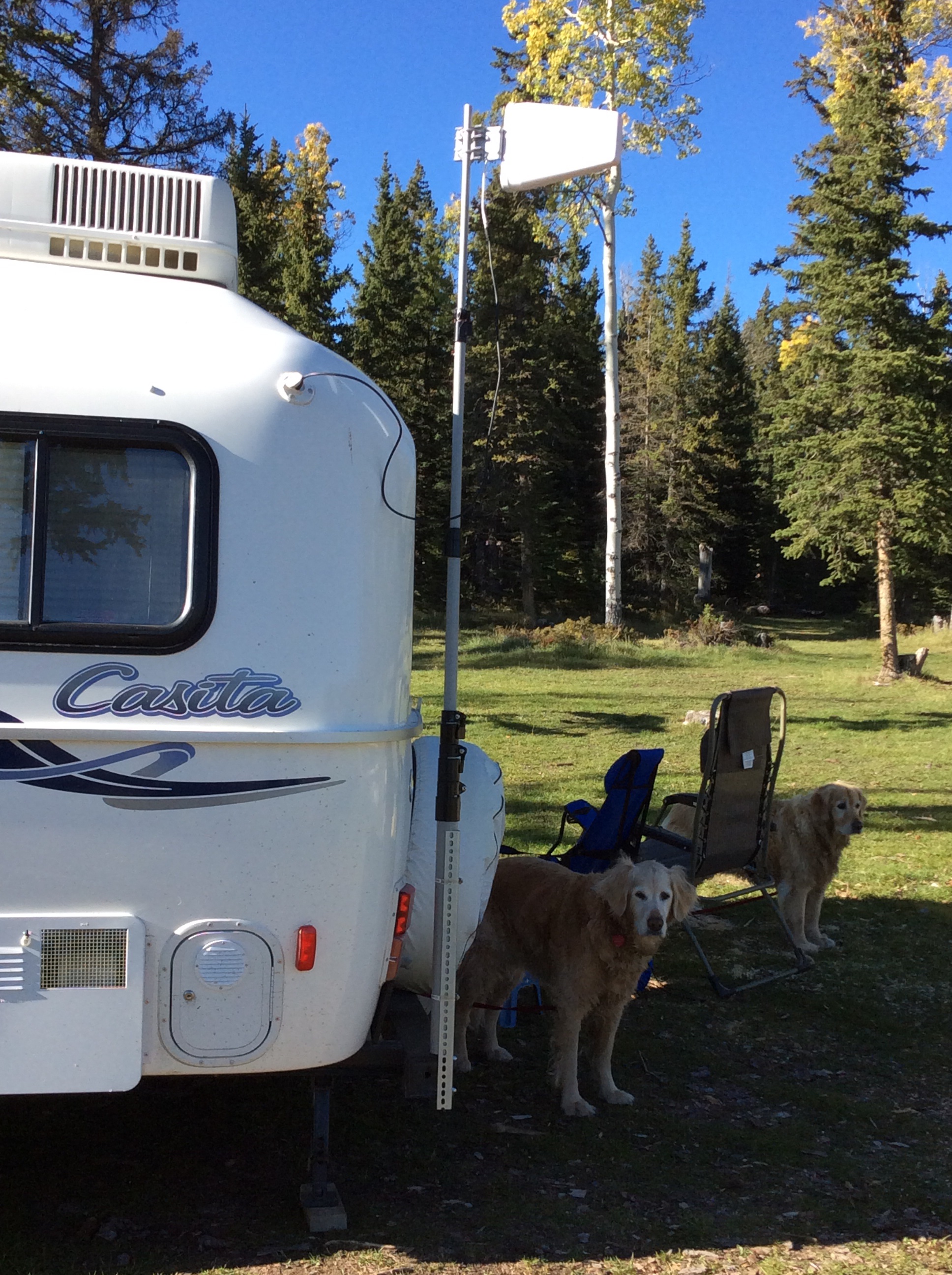 With great anticipation I fasten my Joel Pole to WS’s back bumper.  It has the capacity to rise 10 feet!  I connect the cable to the tv hook up thingie, and Yay! Three bars, sometimes four bars, magically appear!  Is that cool or what?  I immediately text Laura to let her know the JP is working.