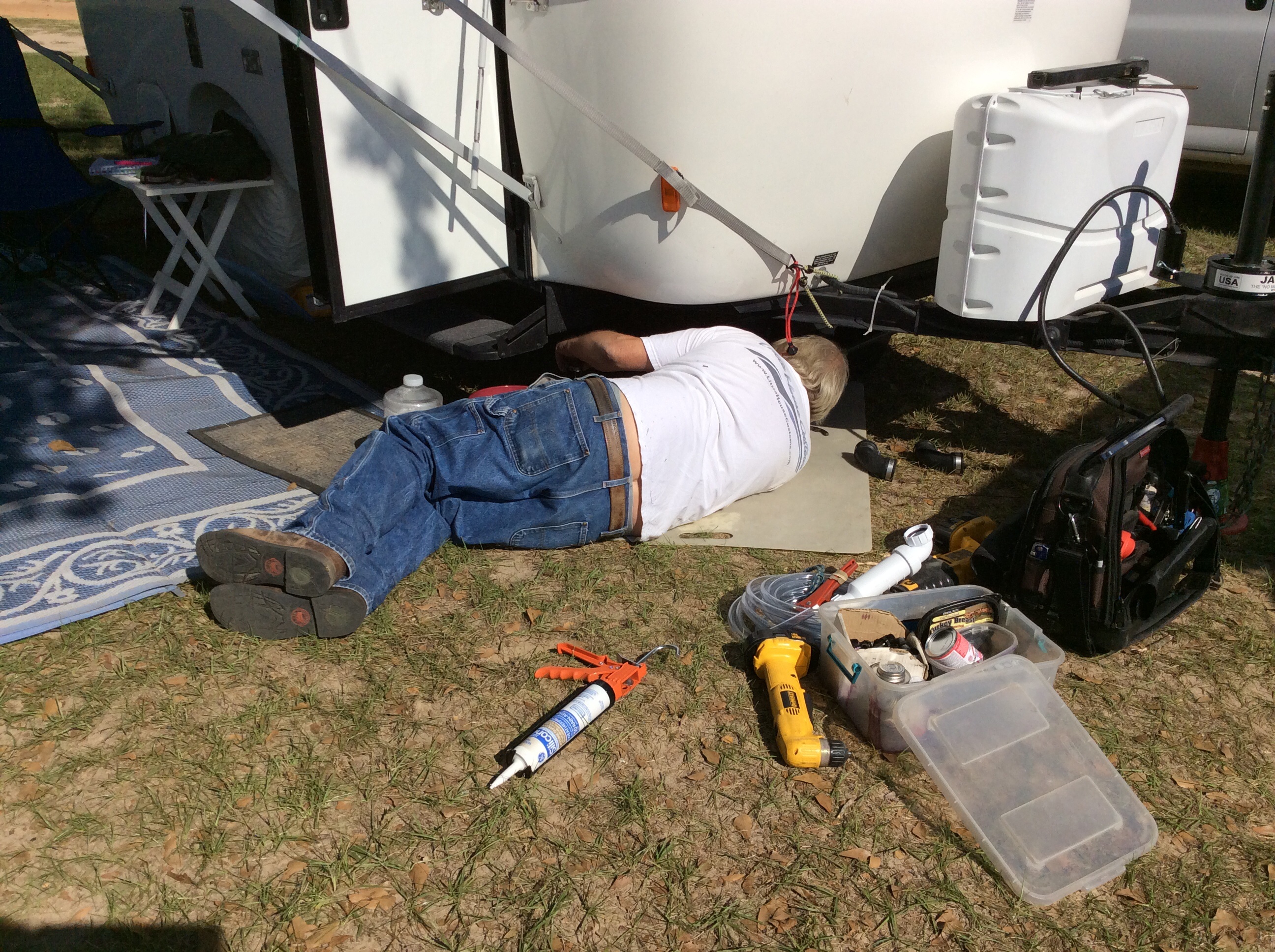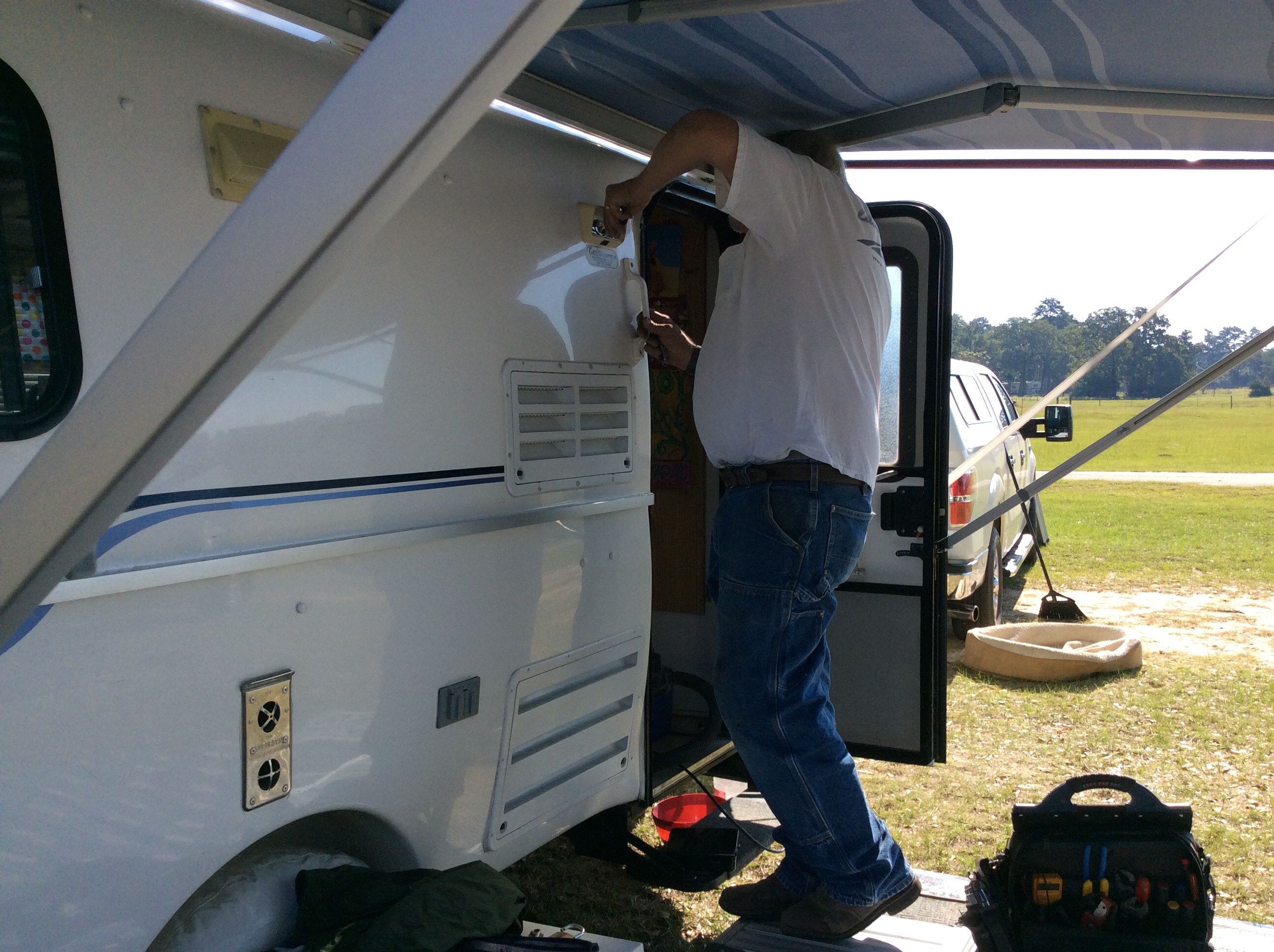 1.  I’ve been carrying an Max Air fan cover around with me forever, and he installed it over my Fantastic Fan on the roof.  Now if it’s raining I can still use the fan so air can circulate.