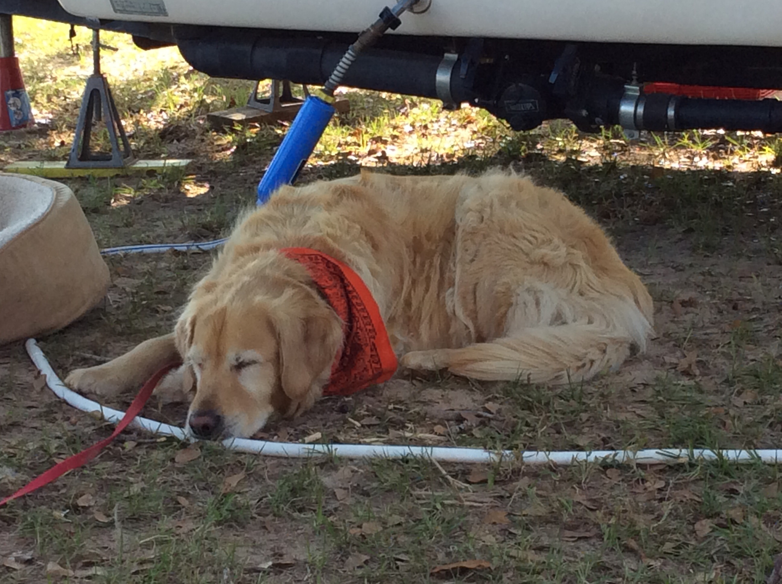 Joy and Shiloh have only escaped once.  Joy came right back…wow her behavior has vastly improved in her more mature years.  Shiloh, as you might have guessed by now, made the rounds and visited most every dog in camp before I enticed him to come back with treats.  They took part in the pet parade, which turned into a ‘sit around and talk about our pets while getting to know each other’ deal, which was really nice.
