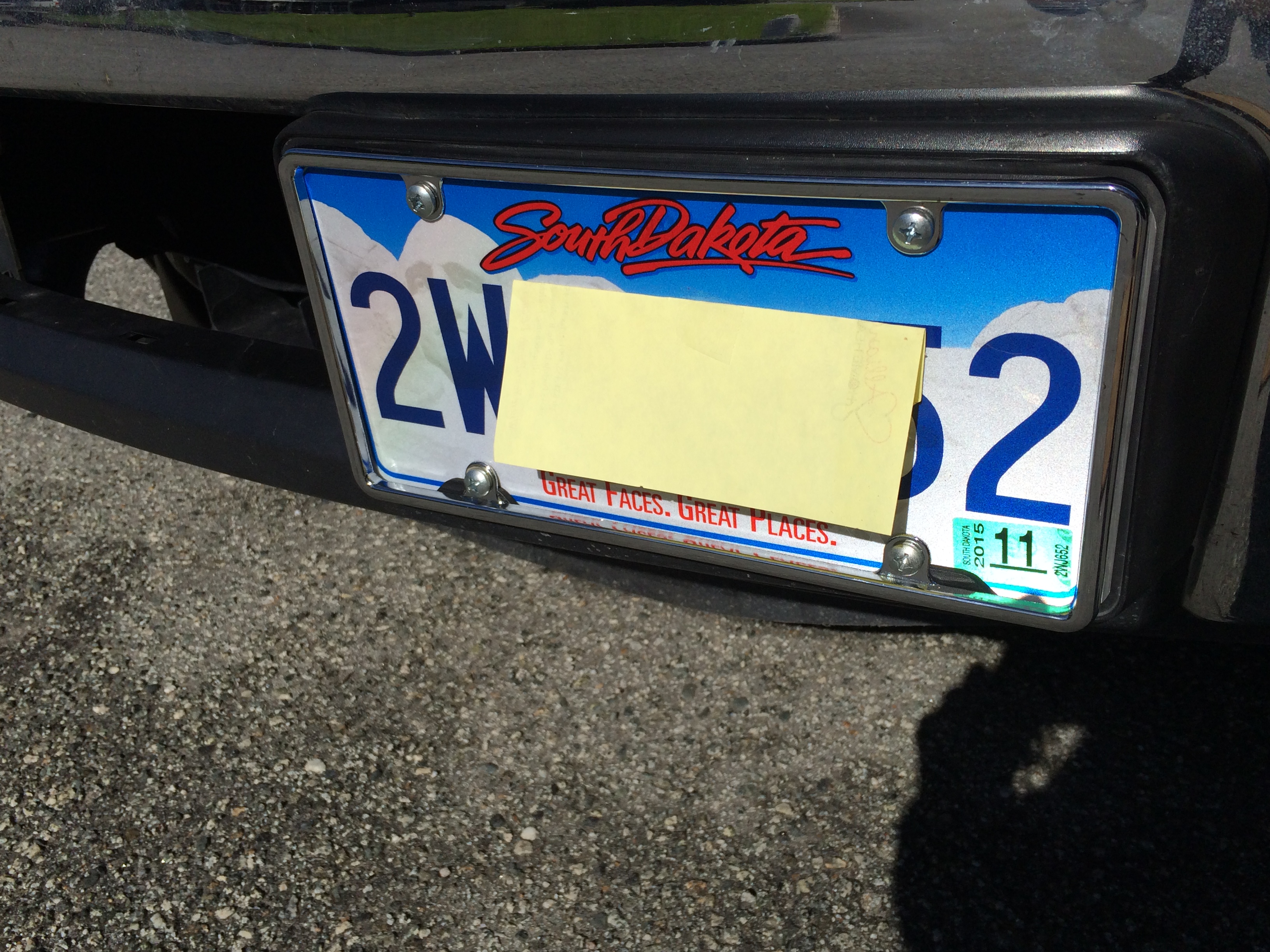 My South Dakota license plates have arrived in the mail and friend Phil puts them on WS and JR for me.
