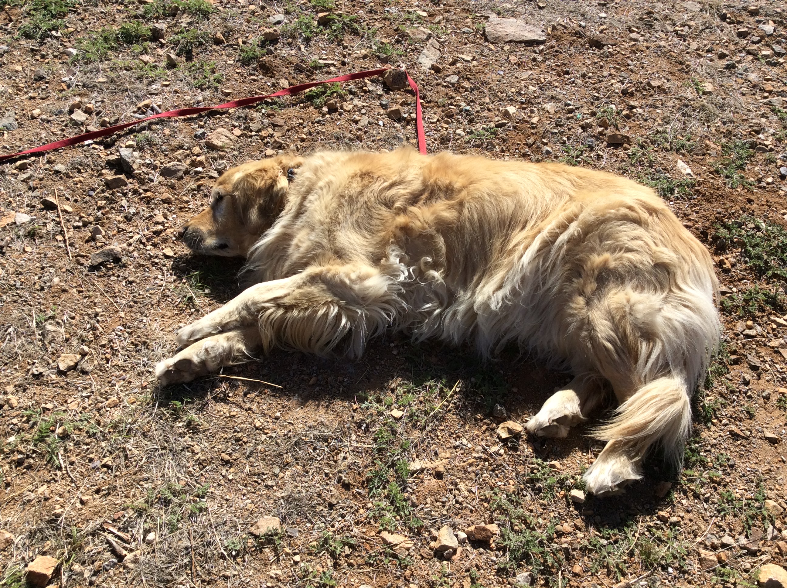 Finally we reach him. I check him over for injuries, but he seems fine. His leash is well woven into and among the cactus. When I find the handle, it’s loaded with cactus pickers. I have to unwind it all and pull out the stickers before I can grasp it. I get stuck a number of times in the process.