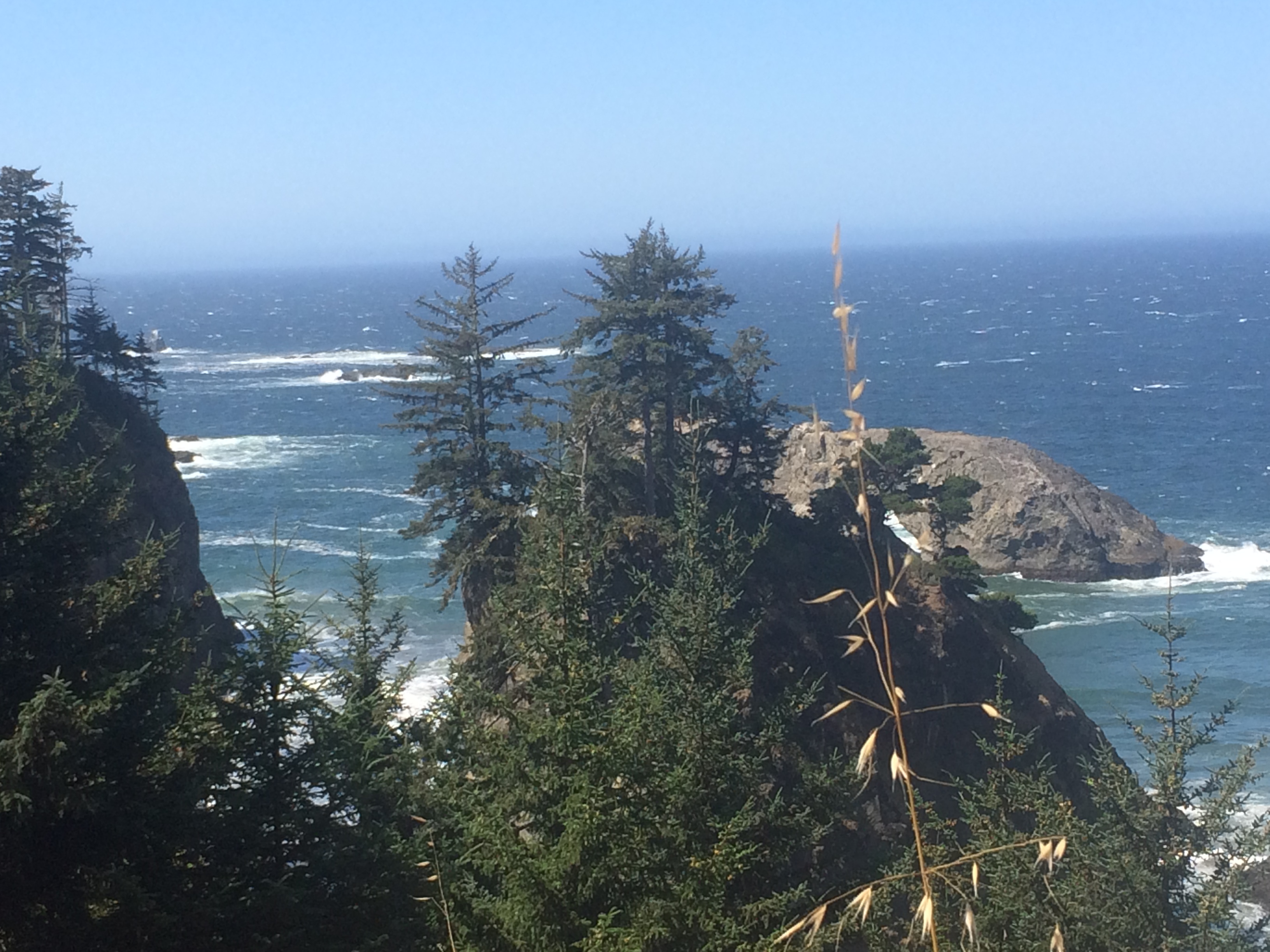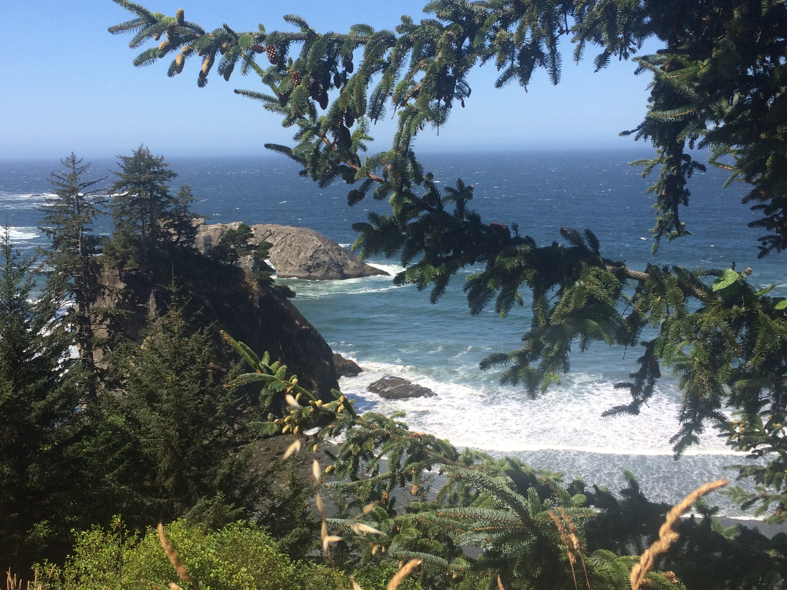 Leaving behind the biggest of the trees, we drive the Oregon coast, north. Mile after mile of amazingly beautiful coastal scenes unfold, along with the fresh ocean breezes. On the left rocks and waves, on the right piney forests.