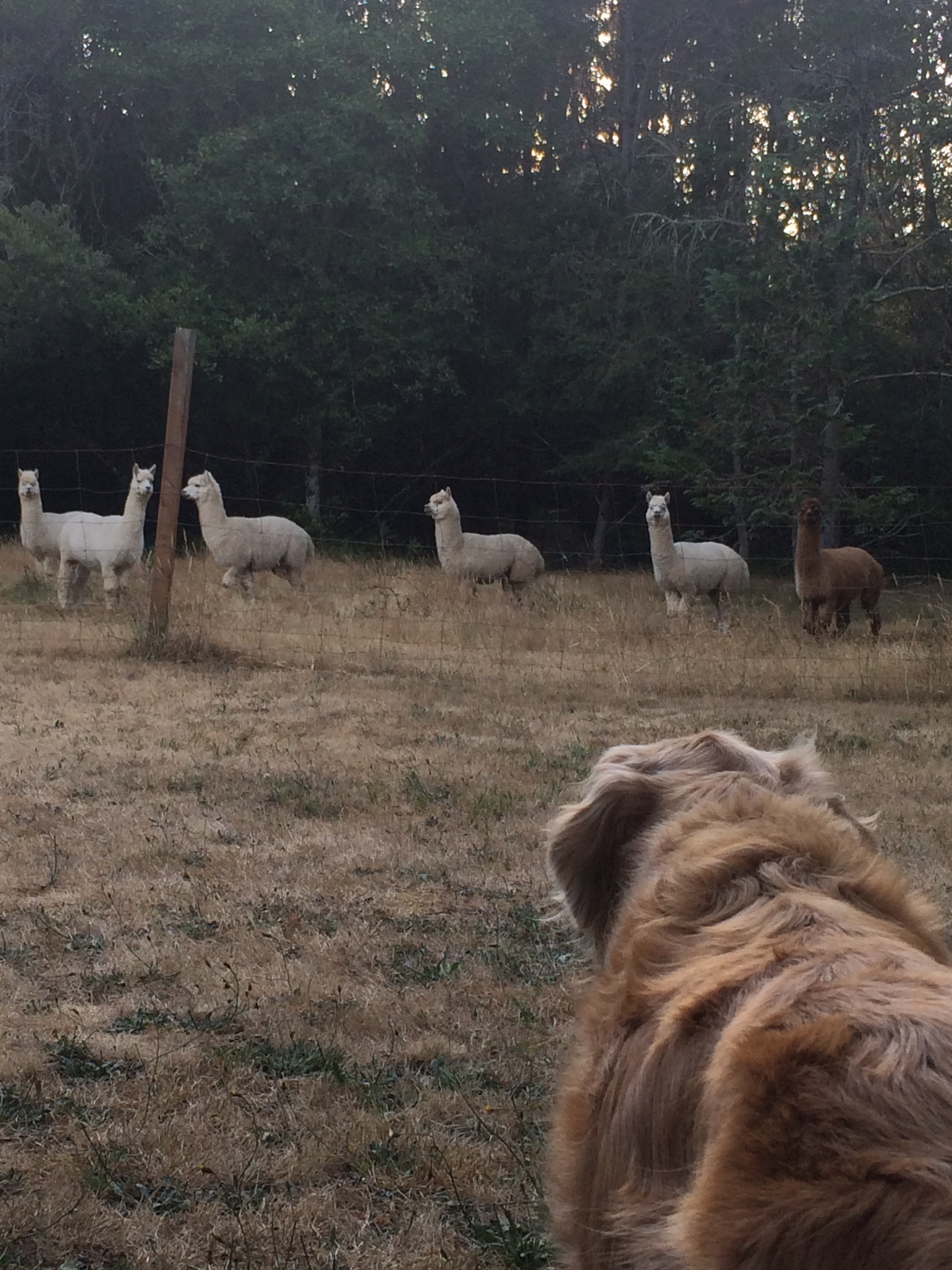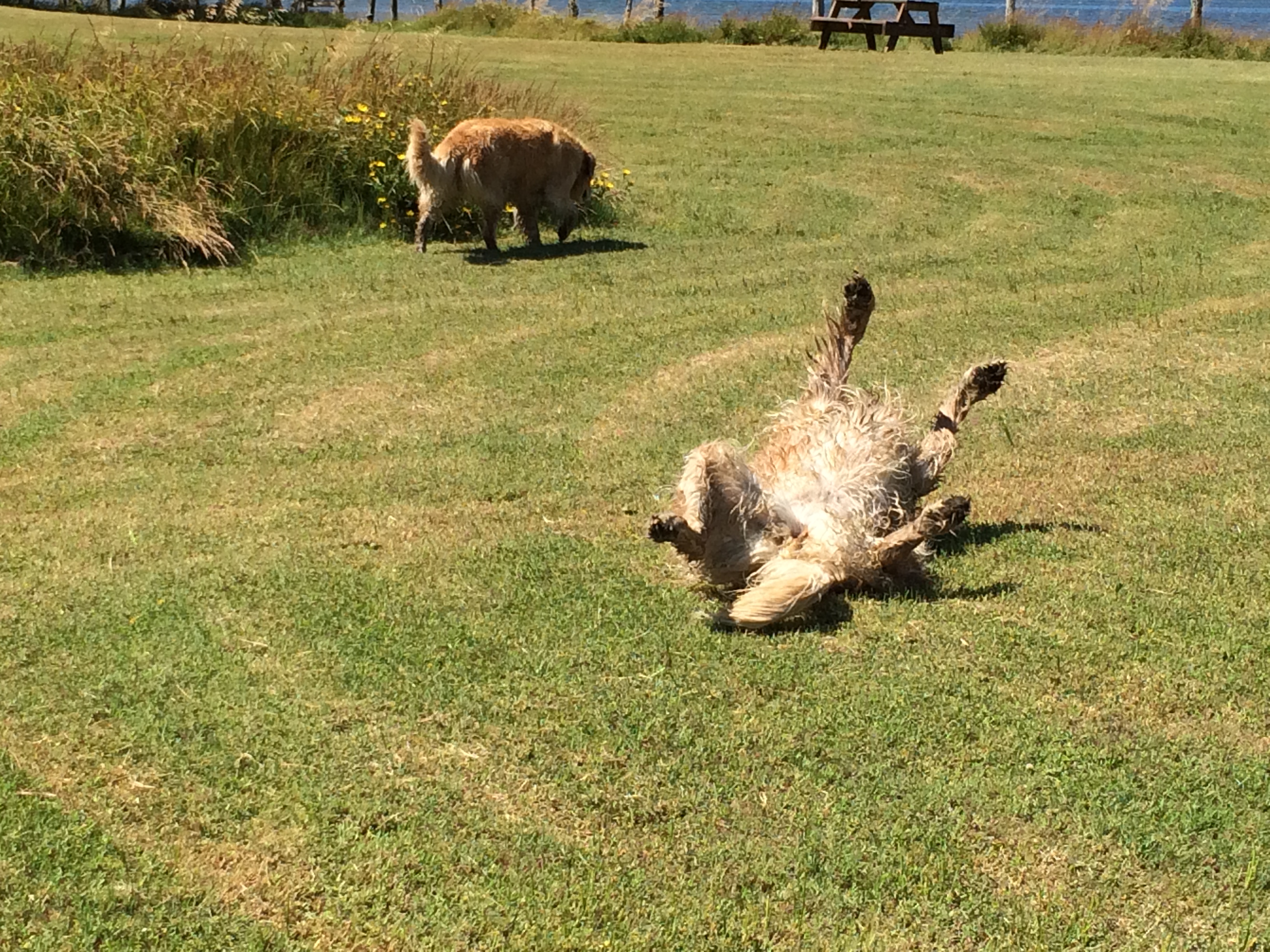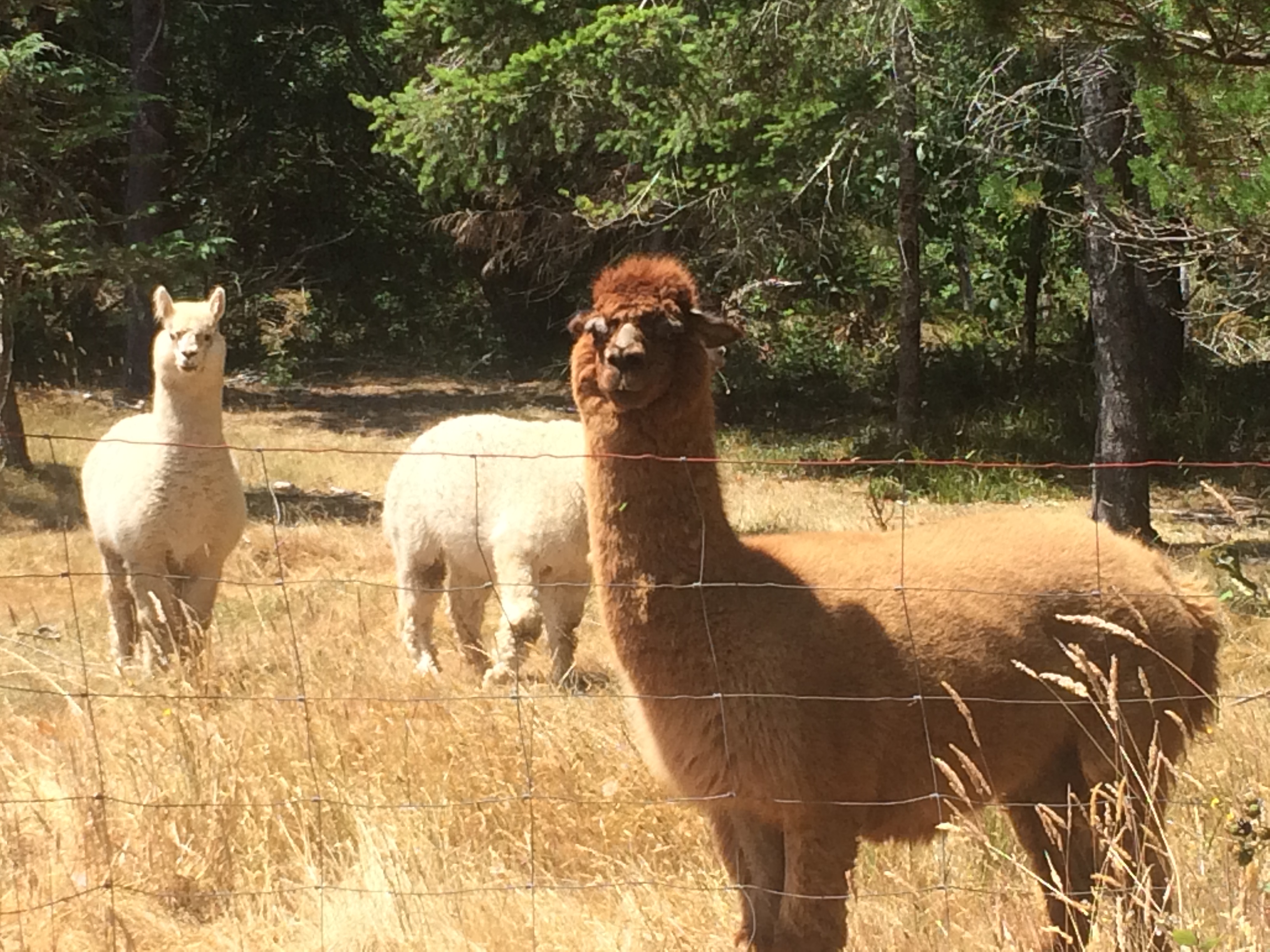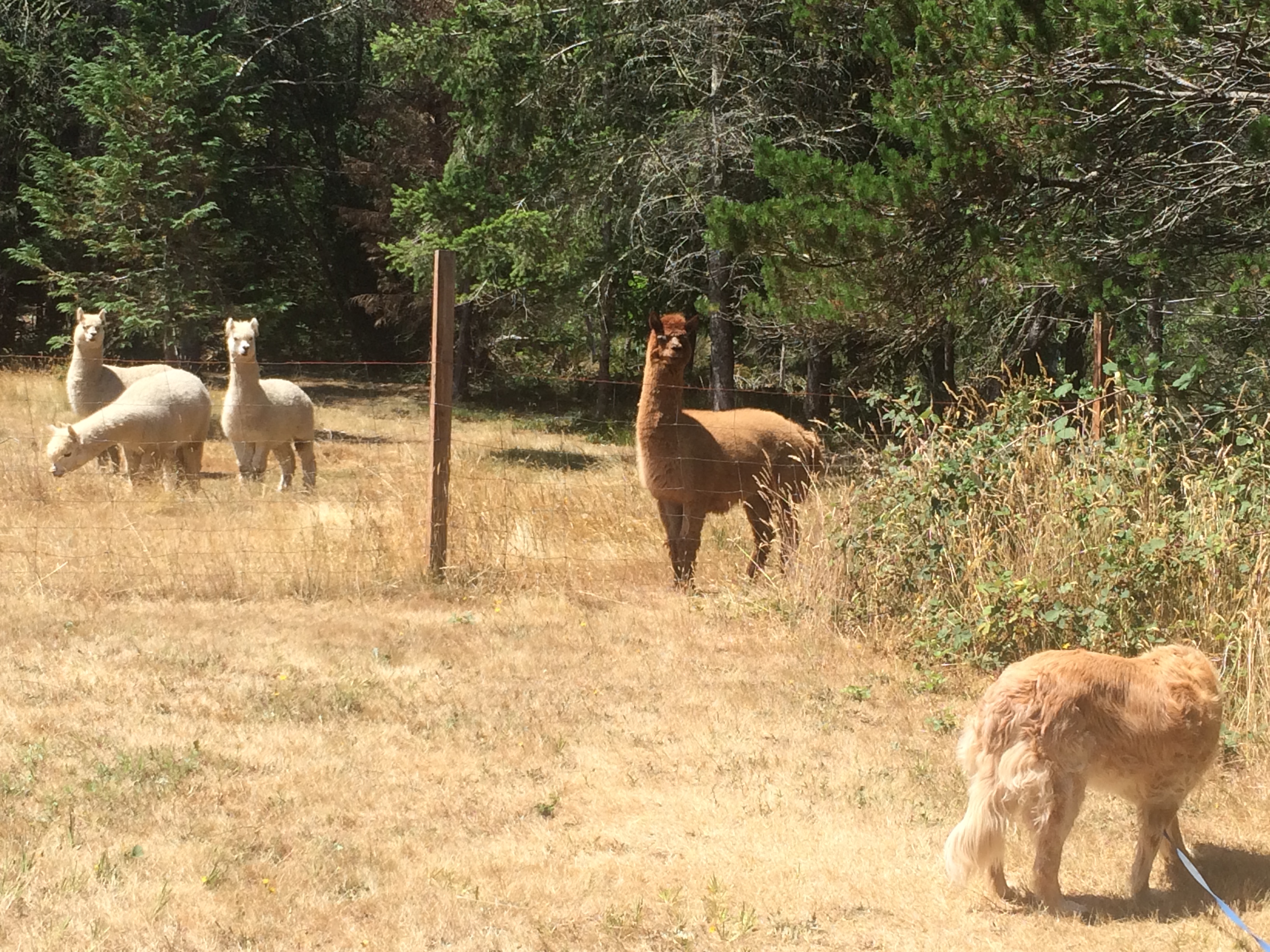 Just past North Bend we dry camp on a field beside some alpacas. For the most part this keeps the dogs and the alpacas occupied. There seems to be this staring contest going on.