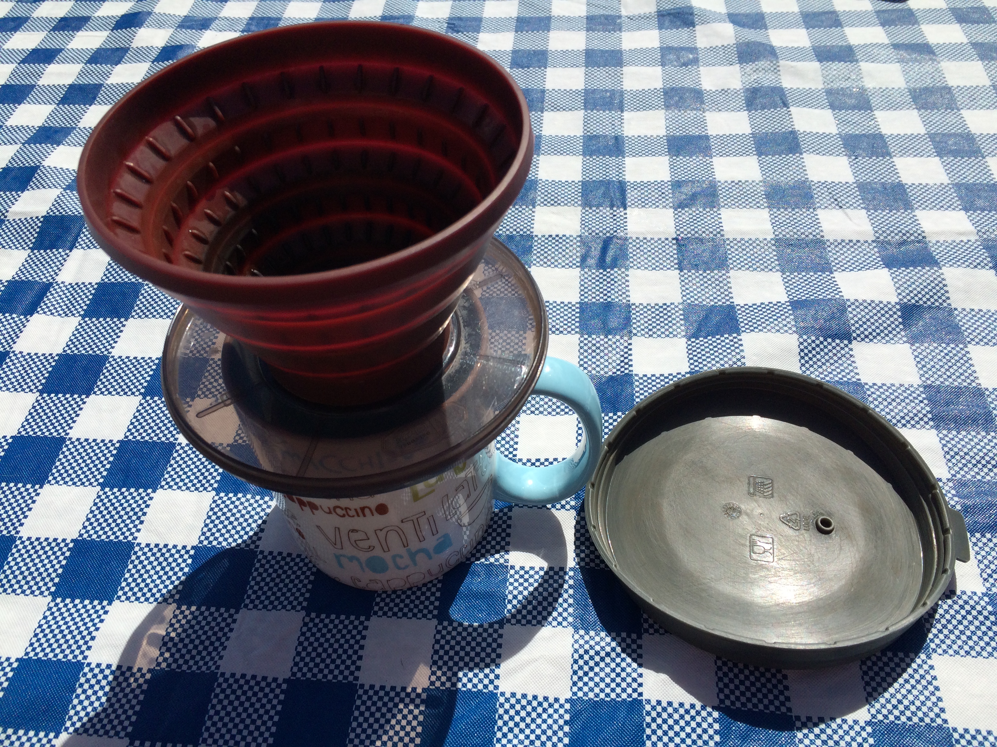 **This is my number ONE kitchen item that I can’t live without! A coffee maker! It’s simply a silicone cone on a plastic base. I put a #4 coffee filter inside, along with two measures of coffee, and set it on top of my mug. Pour in recently boiled water and in a few minutes…walla! Coffee! Actually I use about 1/2 soy milk to 1/2 coffee, so first I have the milk heated and in the cup.