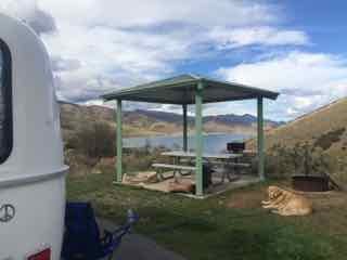 There are two campground sections here. I’m in Chokecherry with full hookups, and the other section is called Great Horned Owl. No hookups there. Both sections have clean showers and bathrooms. It all sits up against Deer Creek Reservoir, and there is a boat launch area down the road.
