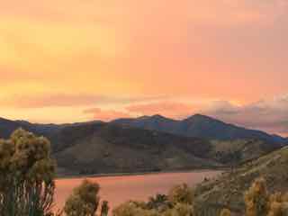 As the sun sets, a pink/peach/gold glow begins over the lake, and it ends up like this: